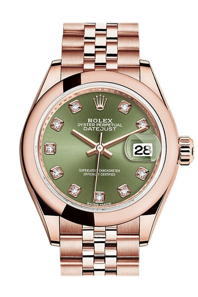 Rolex Datejust 28 Olive Green Diamond Dial Rose Gold Jubilee Ladies Watch 279165 NP