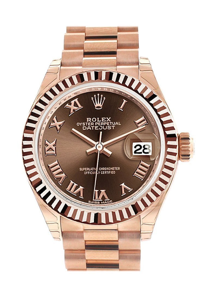 Rolex Datejust 28 Chocolate Roman Dial Fluted Bezel Rose Gold President Ladies Watch 279175 NP