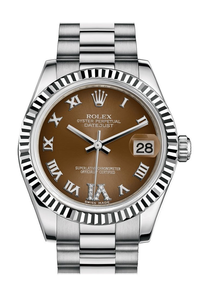 Rolex Datejust 31 Bronze Large VI Diamond Dial Fluted Bezel 18K White Gold President Ladies Watch 178279