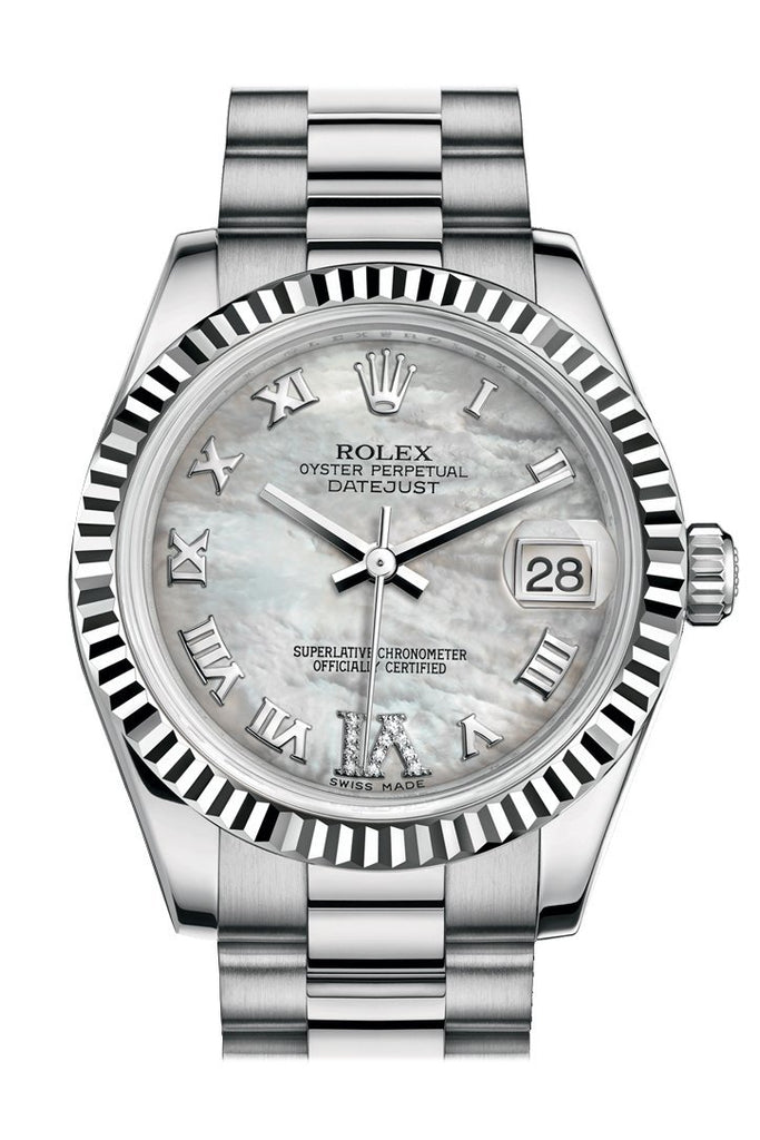 Rolex Datejust 31 White mother-of-pearl Large VI Diamond Dial Fluted Bezel 18K White Gold President Ladies Watch 178279