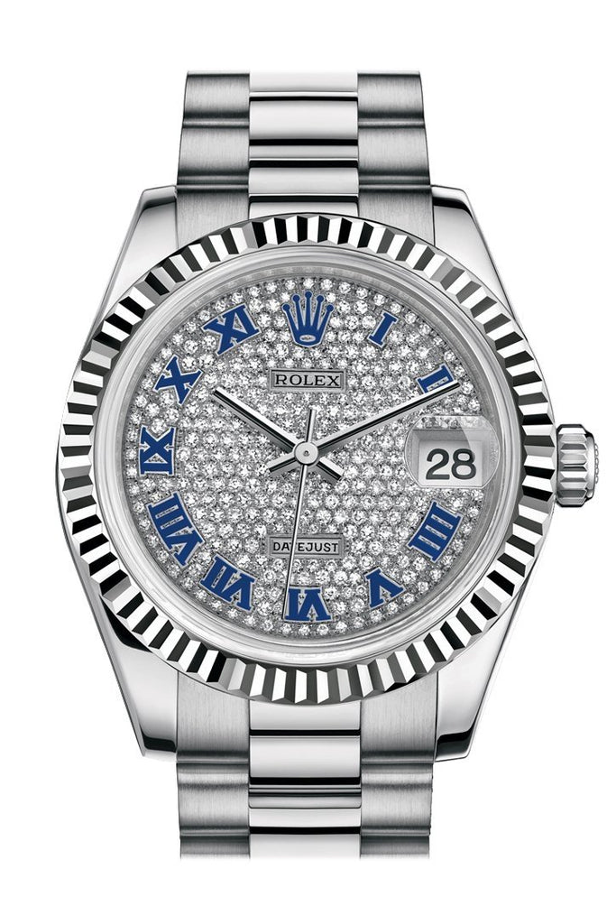 Rolex Datejust 31 Blue Roman Dial Diamond Bezel Lug 18K White Gold President Ladies Watch 178159