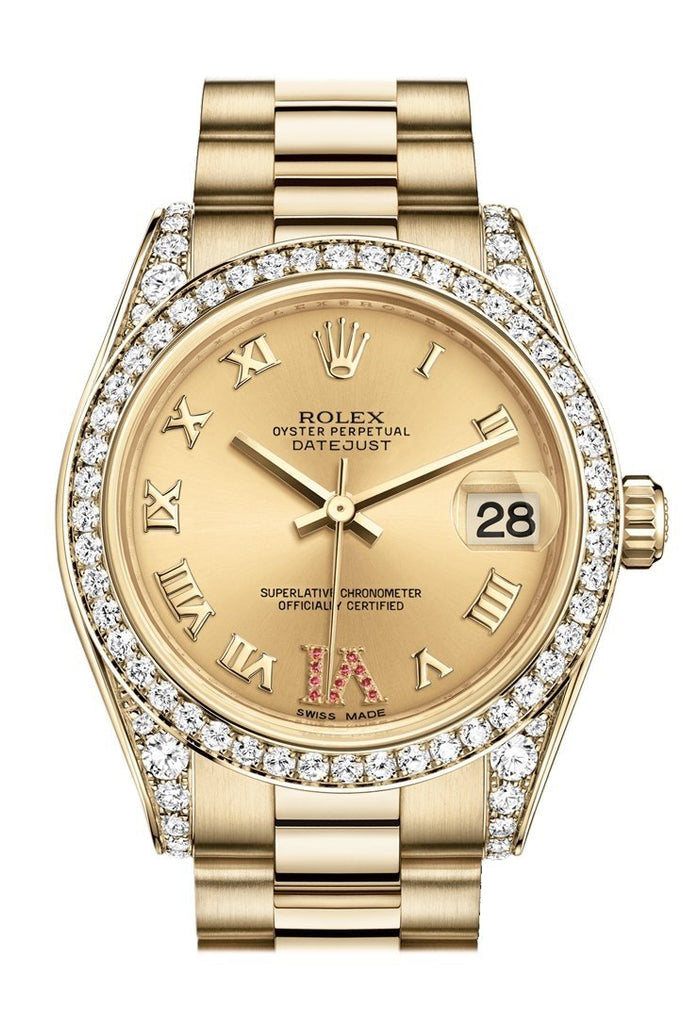 Rolex Datejust 31 Champagne Large VI Rubies Dial Diamond Bezel Lug 18K Yellow Gold President Ladies Watch 178158