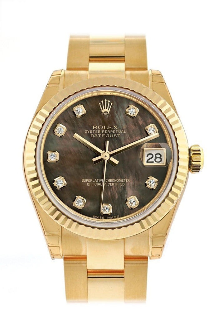 Rolex Datejust 31 Black Mother of Pearl Diamond Dial Fluted Bezel 18K Yellow Gold Ladies Watch 178278