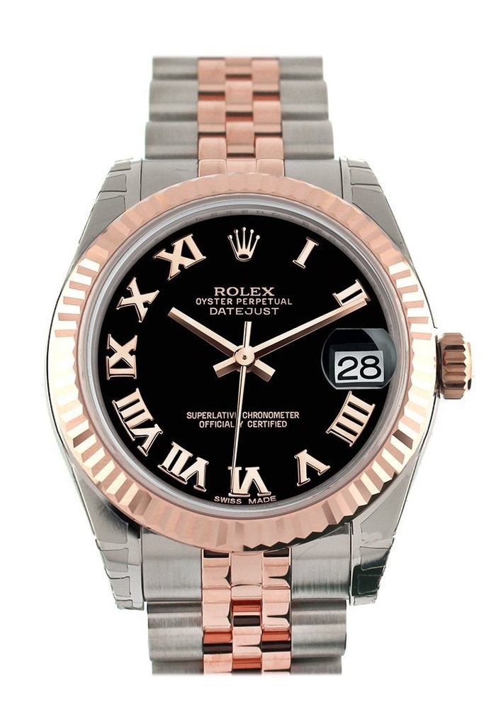 Rolex Datejust 31 Black Roman Dial Fluted Bezel 18K Rose Gold Two Tone Jubilee Ladies Watch 178271