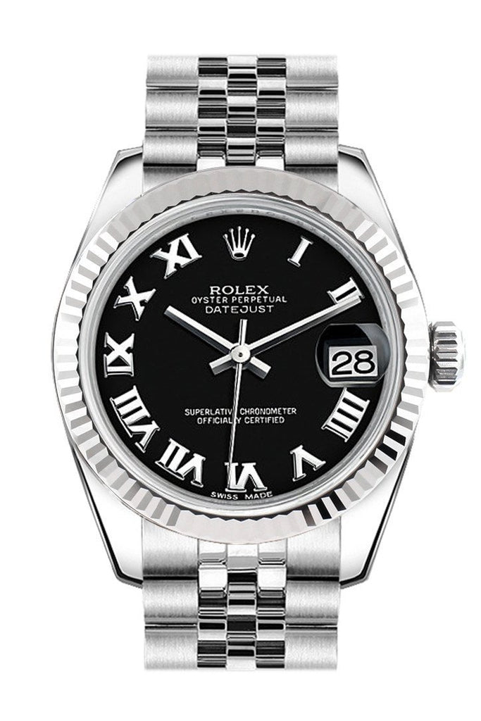 Rolex Datejust 31 Black Roman Dial White Gold Fluted Bezel Jubilee Ladies Watch 178274