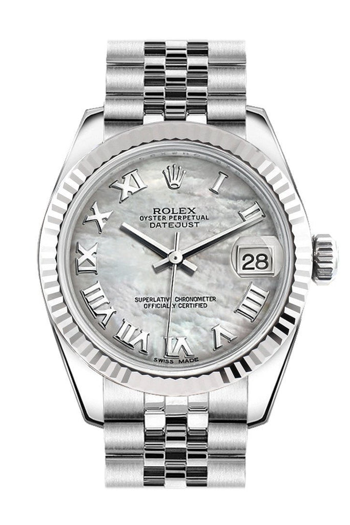 Rolex Datejust 31 White Mother of Pearl Roman Dial White Gold Fluted Bezel Jubilee Ladies Watch 178274