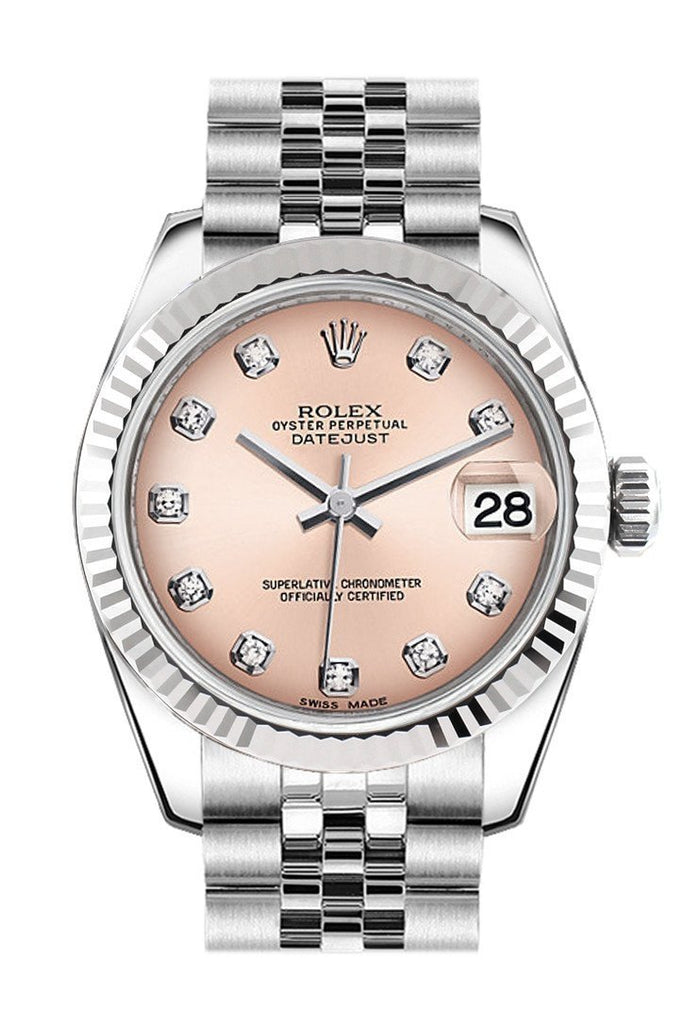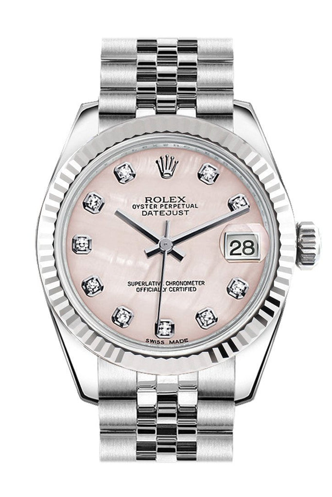 Rolex Datejust 31 Pink Set Diamonds Dial White Gold Fluted Bezel Jubilee Ladies Watch 178274