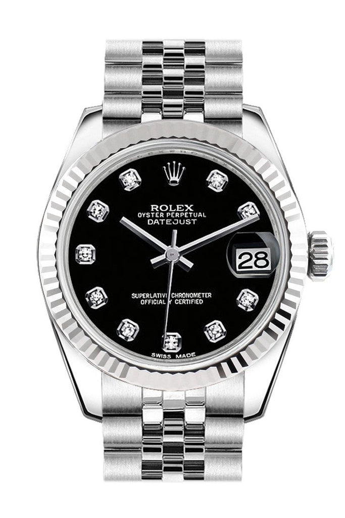 Rolex Datejust 31 Black Set Diamonds Dial White Gold Fluted Bezel Jubilee Ladies Watch 178274