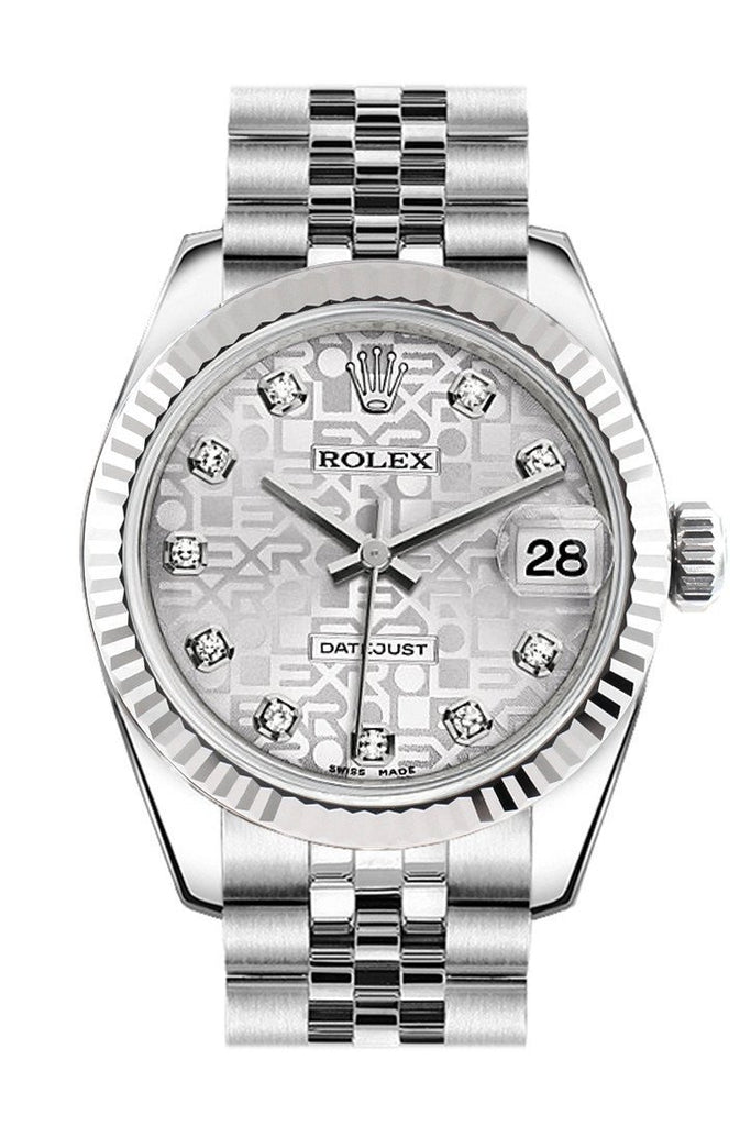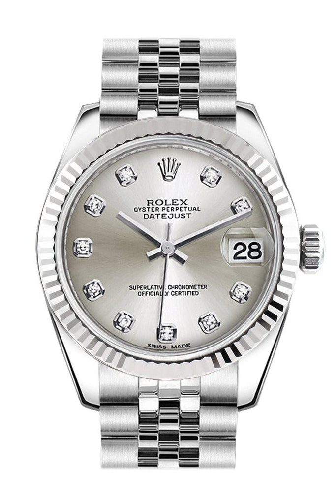 Rolex Datejust 31 Silver Set Diamonds Dial White Gold Fluted Bezel Jubilee Ladies Watch 178274