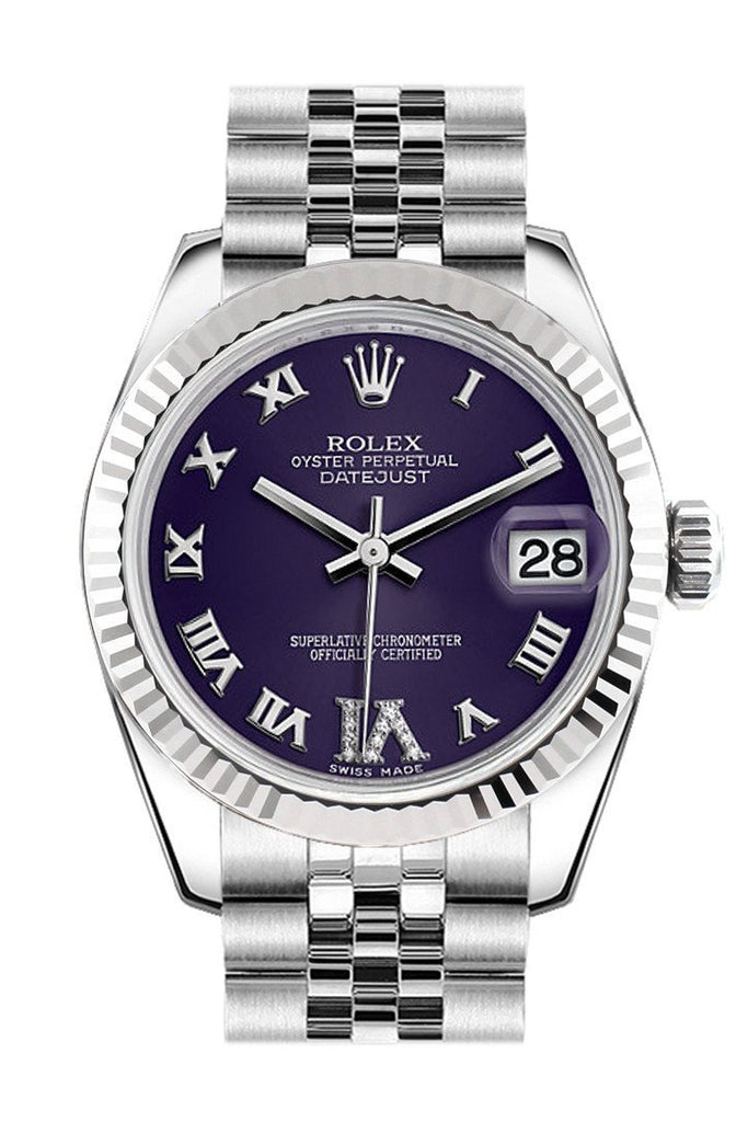 Rolex Datejust 31 Purple Roman Large VI Diamond Dial White Gold Fluted Bezel Jubilee Ladies Watch 178274