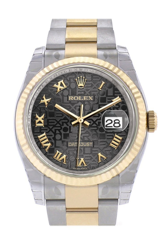 Rolex Datejust 36 Black Jubilee Roman Dial Fluted 18K Gold Two Tone Oyster Watch 116233