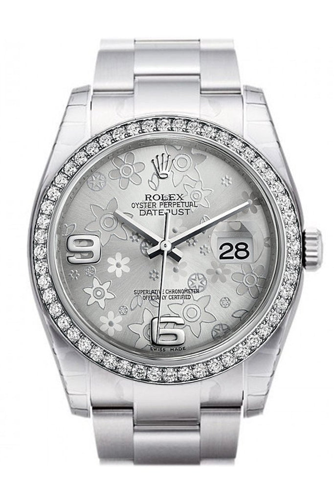 Rolex Datejust 36 Silver floral motif Dial 18k White Gold Diamond Bezel Men's Watch 116244