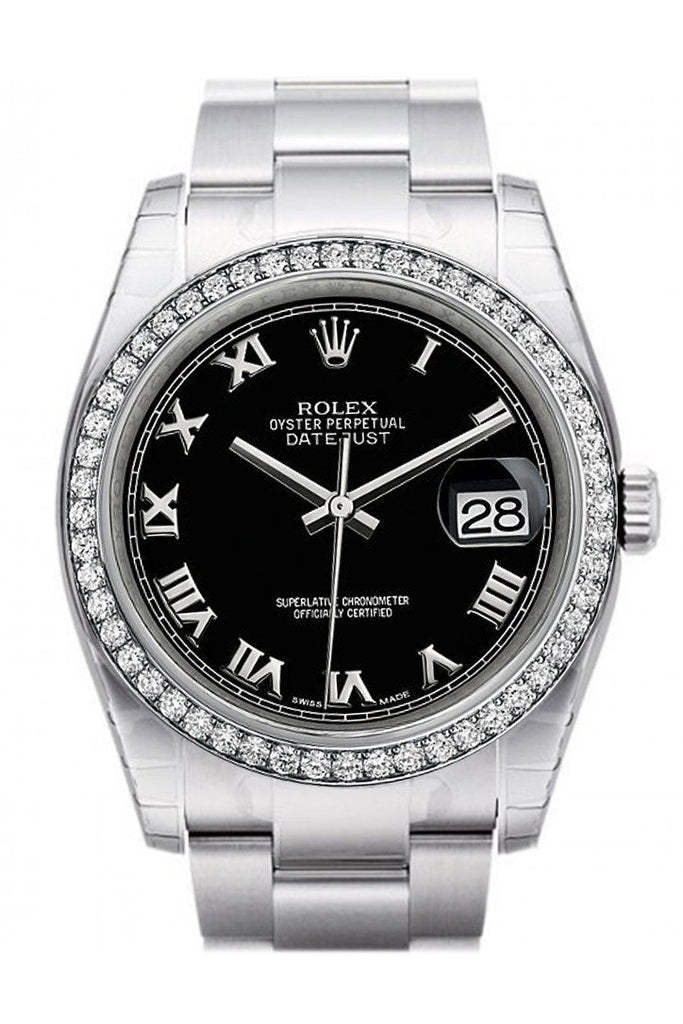 Rolex Datejust 36 Black Roman Dial 18k White Gold Diamond Bezel Men's Watch 116244