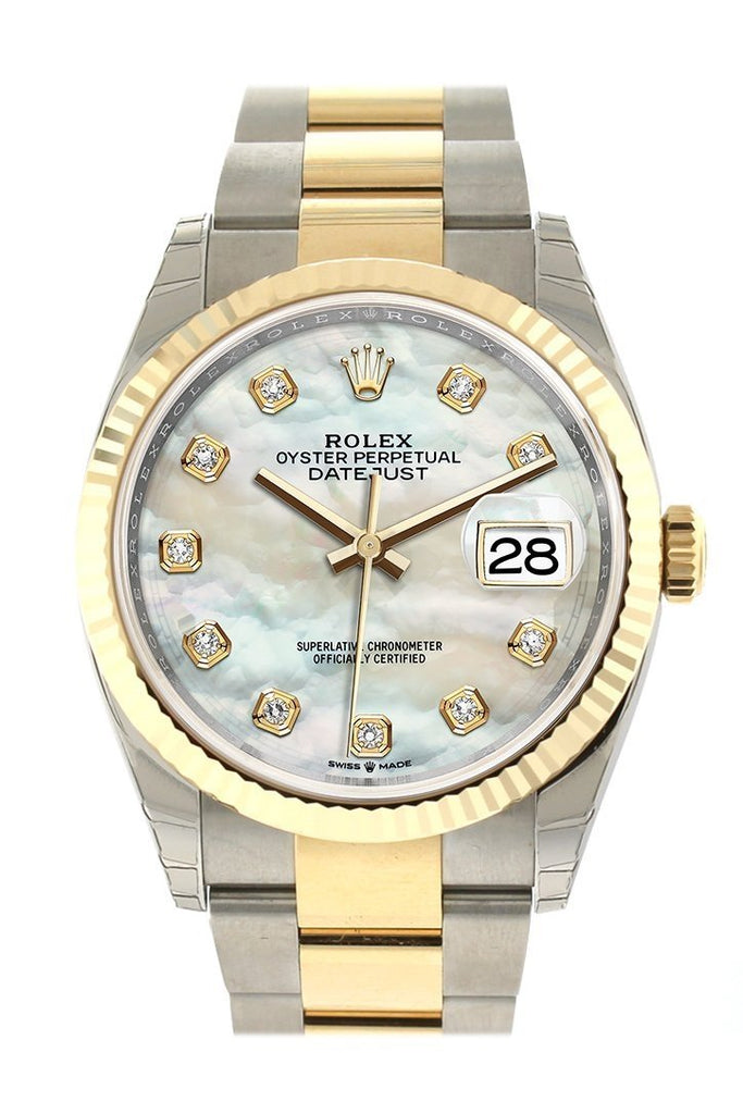 Rolex Datejust 36 White mother-of-pearl Diamonds Dial Fluted Bezel Oyster Yellow Gold Two Tone Watch 126233 NP