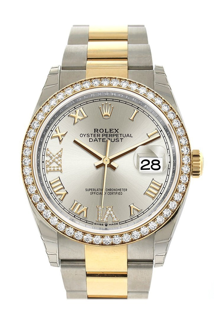 Rolex Datejust 36 Silver set with diamonds Dial Diamond Bezel Oyster Yellow Gold Two Tone Watch 126283RBR 126283 NP