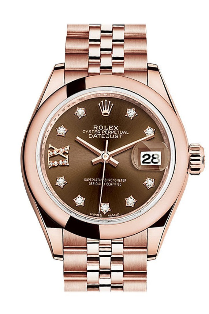 Rolex Datejust 28 Chocolate 9 diamonds set in star Dial Rose Gold Jubilee Ladies Watch 279165 NP