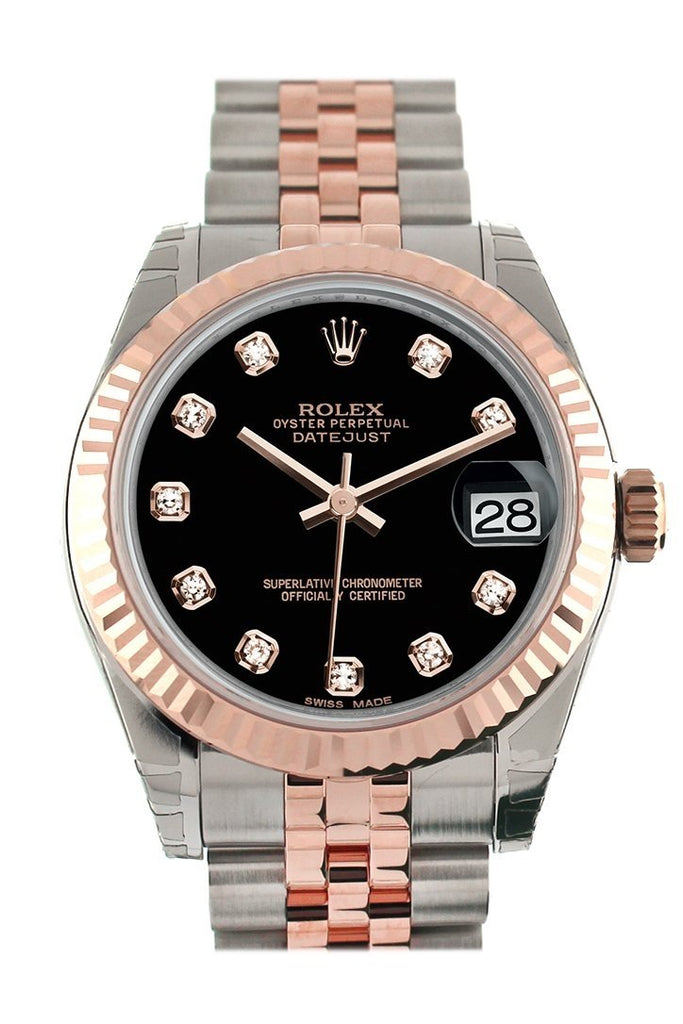 Rolex Datejust 31 Black Diamond Dial Fluted Bezel 18K Rose Gold Two Tone Jubilee Ladies Watch 178271