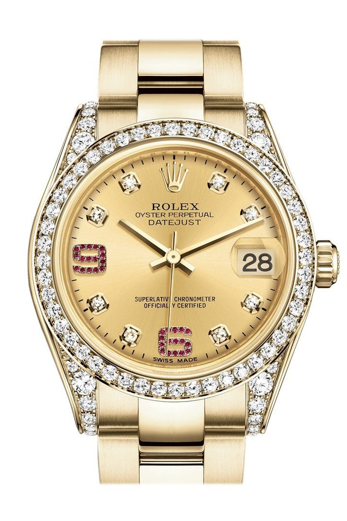 Rolex Datejust 31 Champagne Diamonds Rubies Dial Diamond Bezel Lug 18K Yellow Gold Ladies Watch 178158