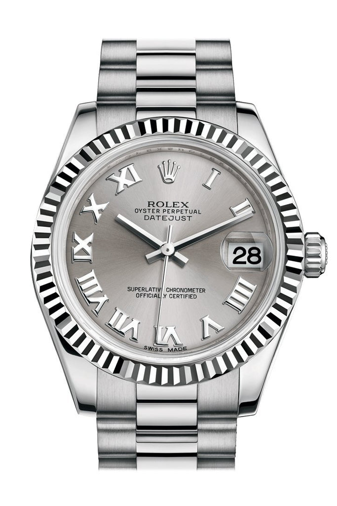 Rolex Datejust 31 Rhodium Roman Dial Fluted Bezel 18K White Gold President Ladies Watch 178279