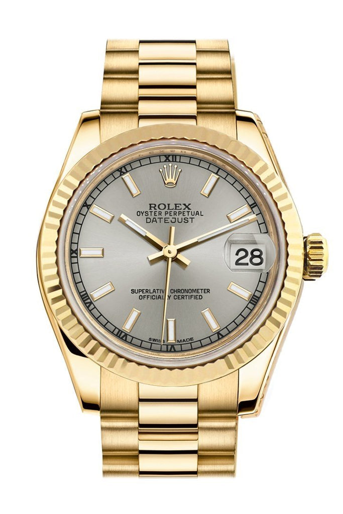 Rolex Datejust 31 Silver Dial Fluted Bezel 18K Yellow Gold President Ladies Watch 178278