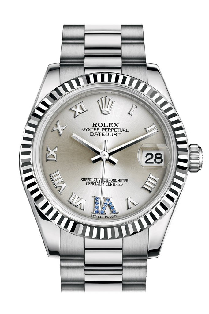 Rolex Datejust 31 Silver Large VI set with sapphires Dial Fluted Bezel 18K White Gold President Ladies Watch 178279