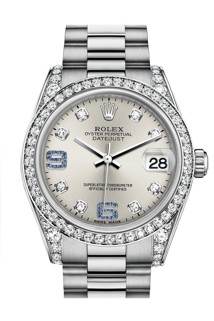 Rolex Datejust 31 Silver set with diamonds and sapphires Dial Diamond Bezel Lug 18K White Gold President Ladies Watch 178159