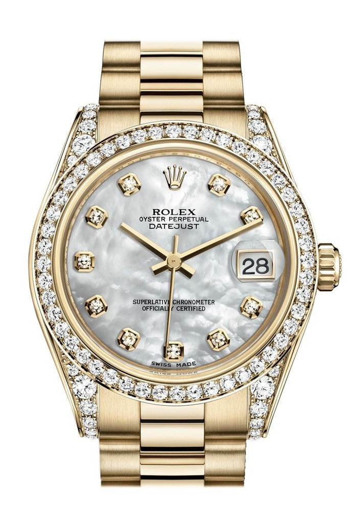 Rolex Datejust 31 White Mother of Pearl Dia Dial Diamond Bezel Lug 18K Yellow Gold President Ladies Watch 178158