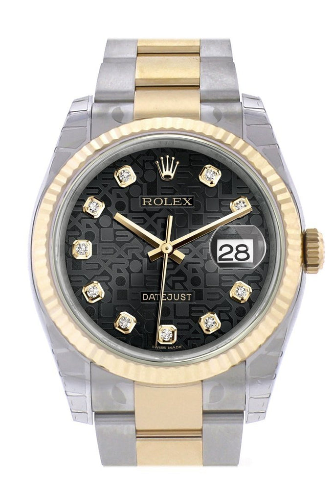 Rolex Datejust 36 Black Jubilee Diamond Dial Fluted 18K Gold Two Tone Oyster Watch 116233