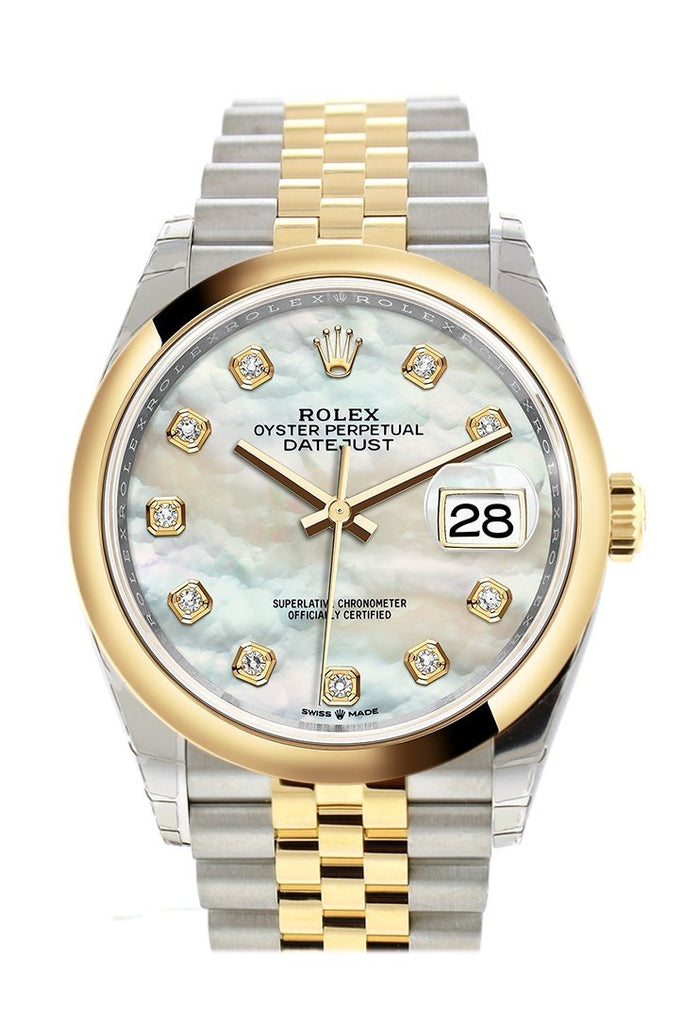 Rolex Datejust 36 White mother-of-pearl set with diamonds Dial Dome Bezel Jubilee Yellow Gold Two Tone Watch 126203 NP