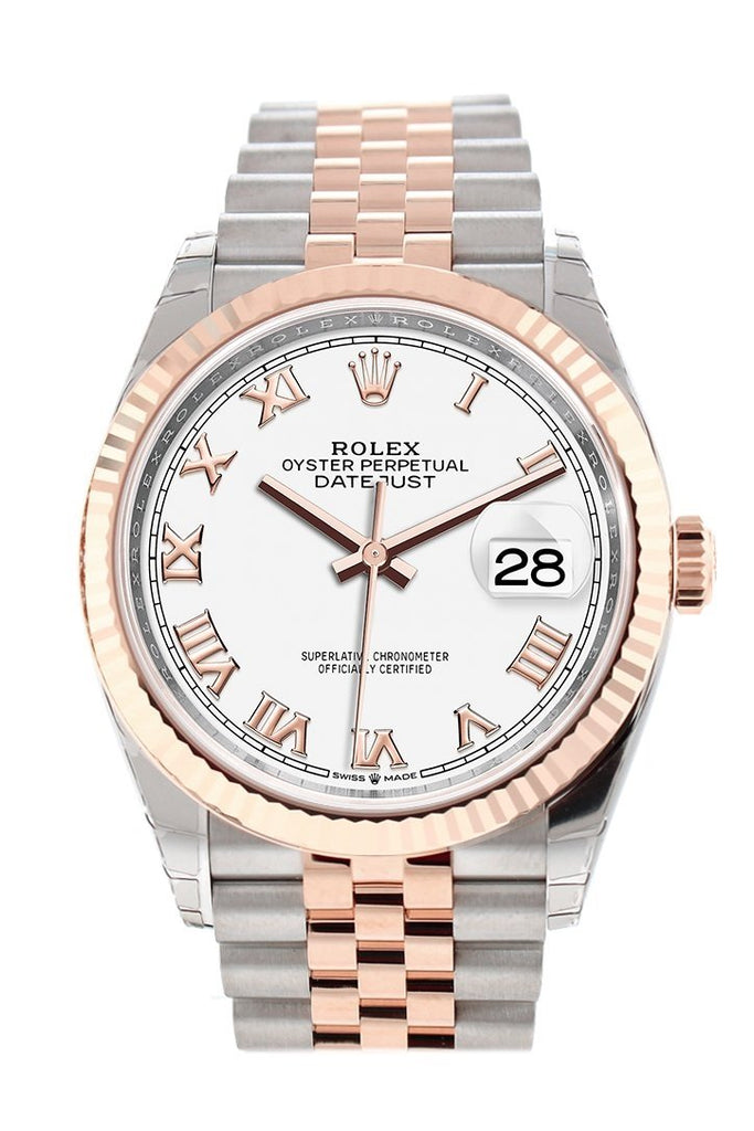 Rolex Datejust 36 White Roman Dial Fluted Rose Gold Two Tone Jubilee Watch 126231 NP